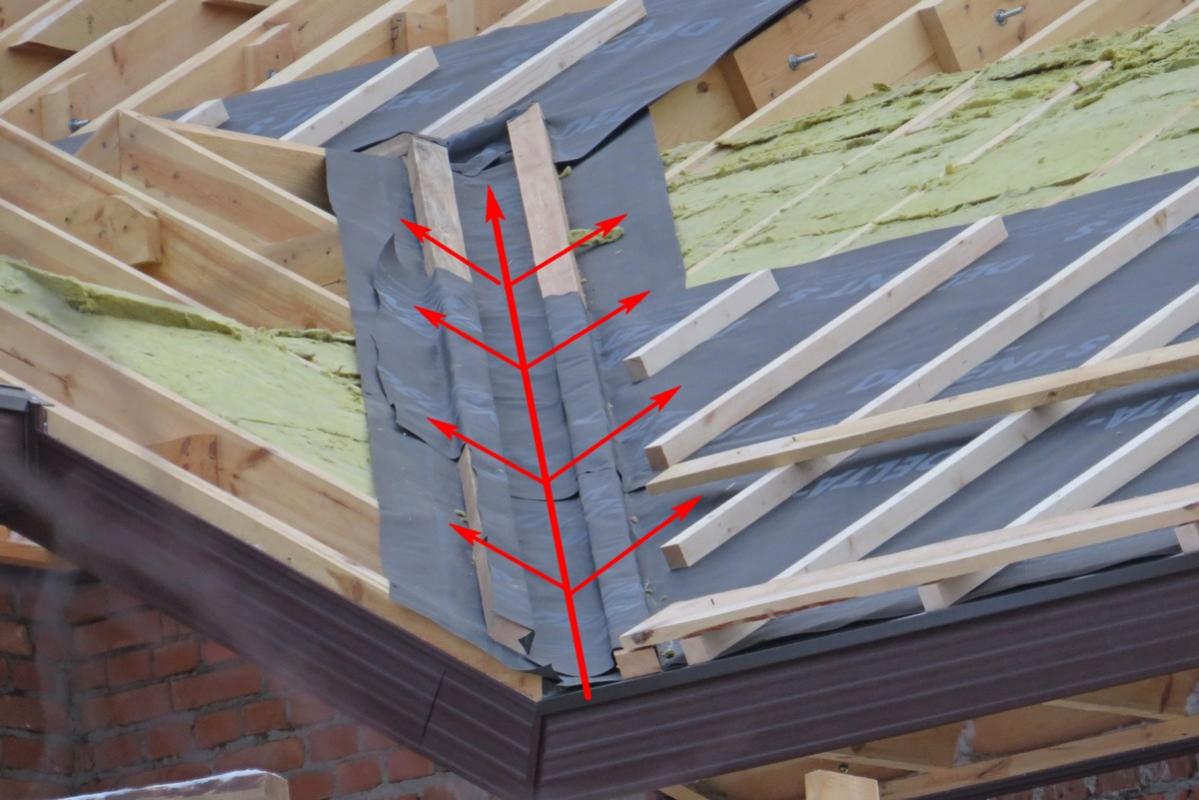 Sur les chevrons d'extrémité, ils sont posés pour la résistance de la planche avec un sol continu. La membrane de superdiffusion est donc posée sur un tel plancher. La vapeur s'érode à travers l'espace de ventilation. Sous cette membrane, aucun dégagement n'est nécessaire. L'élément vallée est monté sous la toiture.