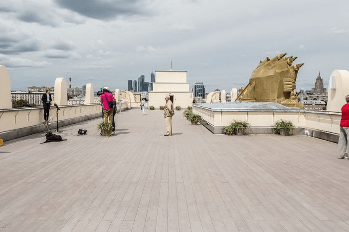 Pour accéder à ce toit, vous devez leur acheter un billet pour le parc. Gorki (rue Krymsky Val, 9). Si vous avez un ticket, vous pouvez utiliser gratuitement des jumelles. La plateforme offre une vue à 360 °. Il est conçu pour un séjour simultané jusqu'à 30 personnes.