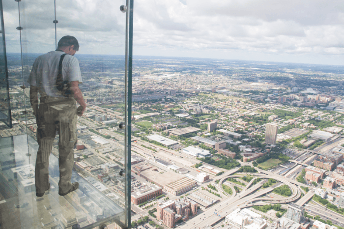 Willis Tower (Chicago, États-Unis). Au 103ème étage de la tour, des balcons avec un plancher transparent sont équipés.