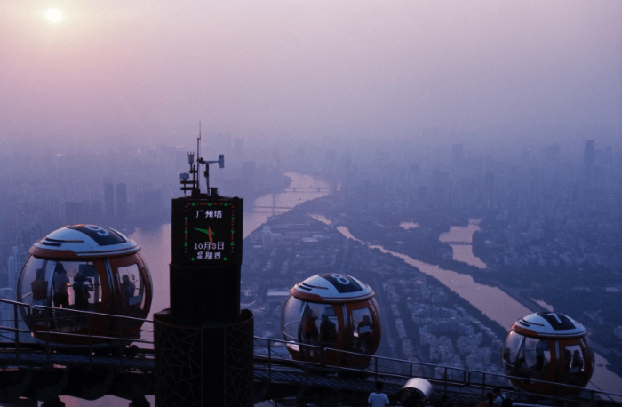 Tour de télévision de la tour de Canton (Guangzhou, Chine). Le point d'observation le plus haut du gratte-ciel est situé à une altitude de 488 m au-dessus du sol.