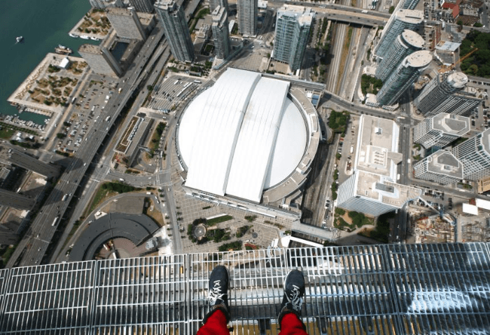 Tour CN (Toronto, Canada). Il existe plusieurs plates-formes d'observation, des sections d'un sol transparent et une attraction extrême.