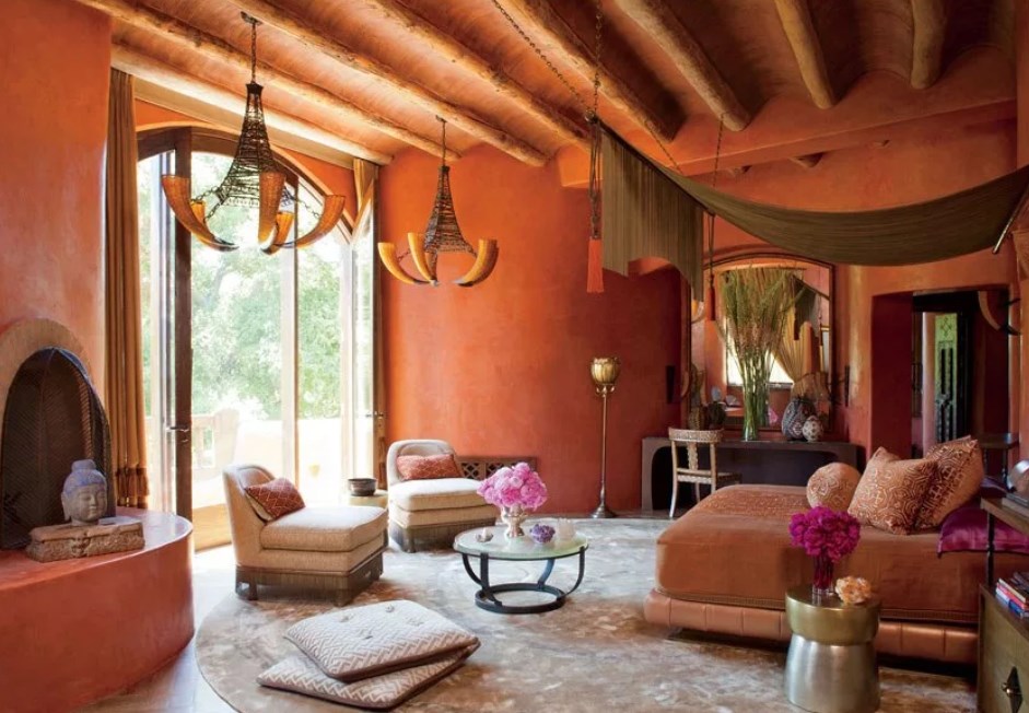 L'architecte a dû travailler dur pour créer une maison pour les célébrités et leurs enfants, car ils devaient construire sur un site avec un terrain très difficile. Mais maintenant, le couple a une résidence très intéressante, où une place est prévue pour chaque membre de la famille. Le design combine époques et styles, en utilisant des motifs et des tissus indiens et orientaux, des bijoux et des motifs. Les plafonds en stuc sont décorés de poutres de vieilles maisons.