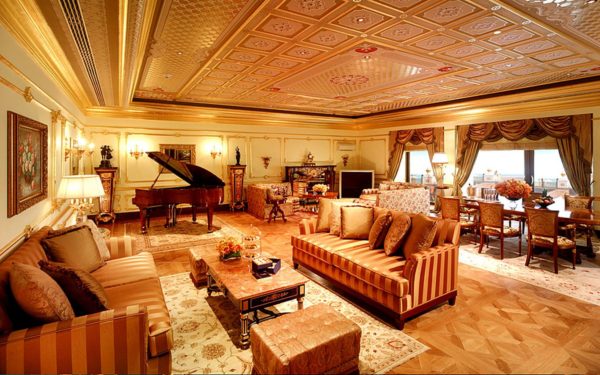 Quel est l'appartement le plus remarquable? Les fresques de l'auteur sur les murs sont appliquées ici. Vous pourrez admirer le piano blanc comme neige, situé à côté de la scène.