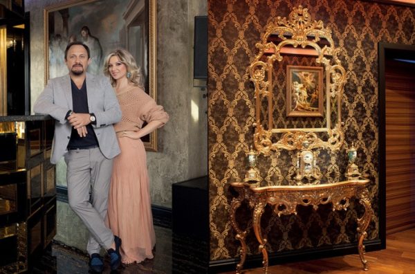 L'intérieur du logement est réalisé dans une combinaison d'or et de noir.Le salon est décoré d'un canapé en cuir chic. Même l'intérieur de la chambre du couple des Mikhailov est conçu en noir.