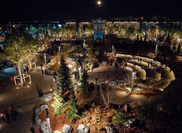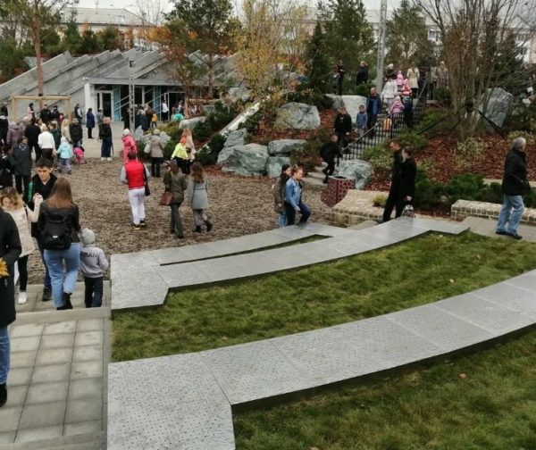 Lorsque vous arrivez à cet endroit, vous voulez involontairement faire un parallèle avec le parc Zaryadye, situé à Moscou. Le territoire est équipé de pierres, d'arbres plantés, de plantes herbacées, dont rares. Tous sont clôturés de manière inhabituelle.