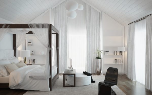 La chambre principale est également de style blanc, mais au centre de la pièce, il y a un lit à baldaquin chic. Le célèbre présentateur de télévision a toujours rêvé d'un tel lit.