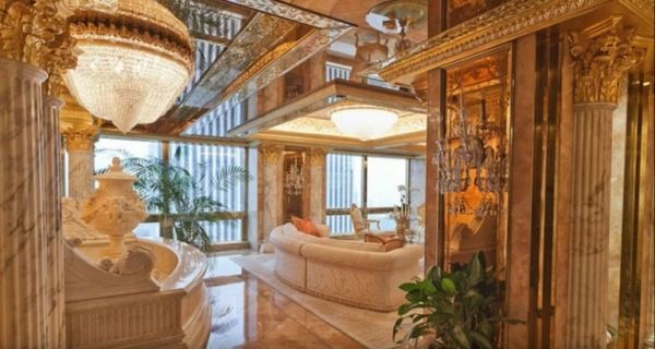 Un penthouse à trois niveaux à Manhattan. Le gratte-ciel est situé sur la Cinquième Avenue. Il y a des bureaux Trump dans la même maison. A l'intérieur, tout est meublé avec goût et assez cher. Le penthouse personnel est décoré dans le style du château de Versailles, tout est recouvert d'or.