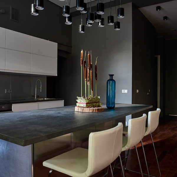 En plus d'un éclairage lumineux à la mode qui délimite l'espace, les concepteurs ont décidé de ne pas apporter de changements radicaux dans la cuisine. Ici, un journaliste bien connu, présentateur de télévision et père à temps partiel d'un enfant de six ans, passe la plupart de son temps à cuisiner, à travailler et à parler avec des amis. Le casque blanc est resté à sa place d'origine. Shepelev l'a acheté dès qu'il est entré dans cet appartement.
