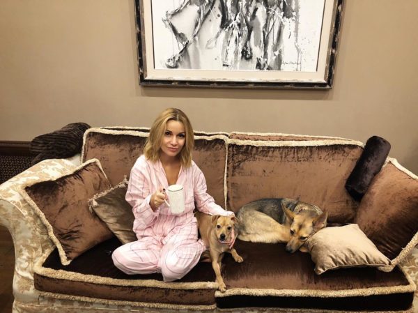 Sur le territoire personnel de l'artiste, les chiens peuvent tout faire. Ils dorment avec la maîtresse sur un grand lit, jouent sur le canapé ou s'ébattent sur des tapis coûteux.