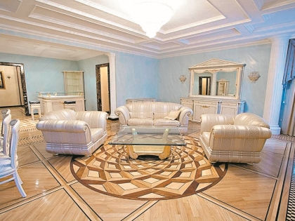 Valentina Ivanovna aime l'intérieur dans des tons dorés, comme en témoignent les éléments décoratifs dans lesquels des moulures en stuc coûteuses sont utilisées. Sur les murs, vous pouvez voir des peintures de reproductions de peintres célèbres. Le salon a des meubles qui ont une touche dorée.