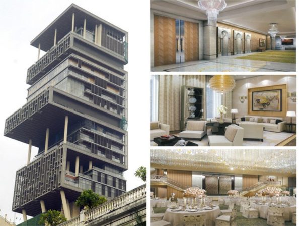 Regardons la maison du milliardaire Mukesh Ambani. Le coût s'élevait à 1 milliard de dollars. La maison a 27 étages et est destinée à l'épouse de Mukesh et à ses trois enfants. La maison dispose d'un parking souterrain, pouvant accueillir 160 voitures, un studio de danse, son propre cinéma.