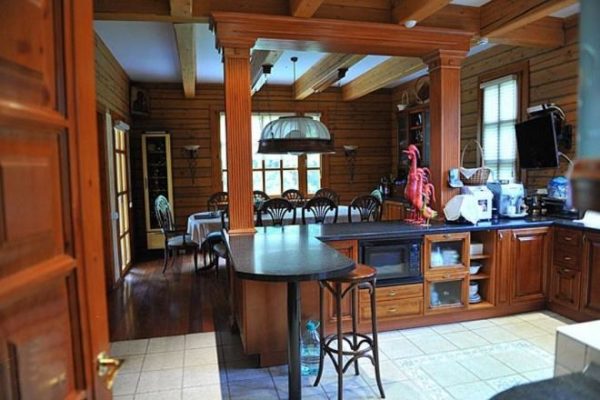 Au rez-de-chaussée il y a une salle à manger combinée avec une cuisine. Dans ce document, les meubles sont fabriqués sur commande à partir d'essences de bois précieuses.Il se marie harmonieusement avec les meubles en osier. La place centrale est réservée à une grande table ronde à manger.