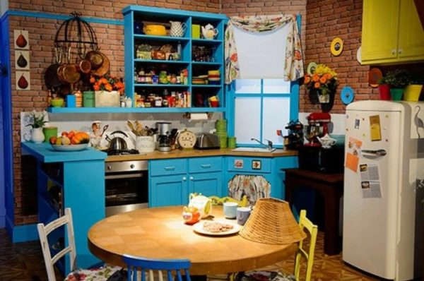 Si vous regardez les chaises colorées, vous ne comprendrez pas immédiatement ce qu'elles font ici. Mais dans l'appartement des "Amis" est un ordre absolu. Toutes les couleurs des chaises vont bien avec les attributs de la cuisine. Les jaunes sont en harmonie avec l'armoire murale jaune, qui est située au-dessus du réfrigérateur. La couleur turquoise est combinée avec l'ombre générale du coin cuisine, et la chaise de couleur pourpre relie parfaitement la cuisine et le salon.
