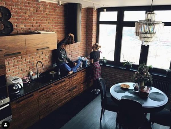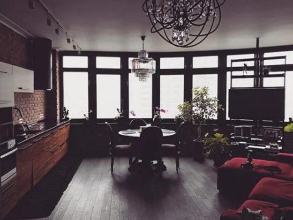 Le salon et la cuisine près de Vodonaeva sont combinés et décorés dans le style d'un loft. Les murs de briques, les meubles noirs et un lustre de style gothique rendent l'intérieur trop sombre.