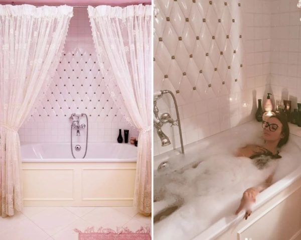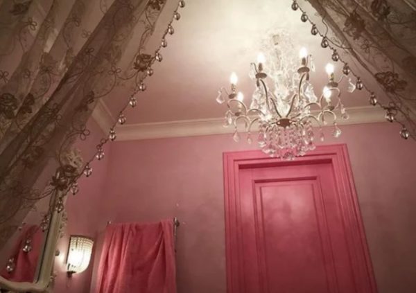 En plus des teintes noires, la star de "House-2" utilise activement la couleur rose dans le décor de sa maison. Sa salle de bain est entièrement finie dans de telles couleurs. D'une salle de traitement de l'eau, Alena a transformé la salle de bain en un luxueux boudoir, dans lequel, en plus des accessoires de bain, il y a un énorme lustre en cristal sous le plafond.
