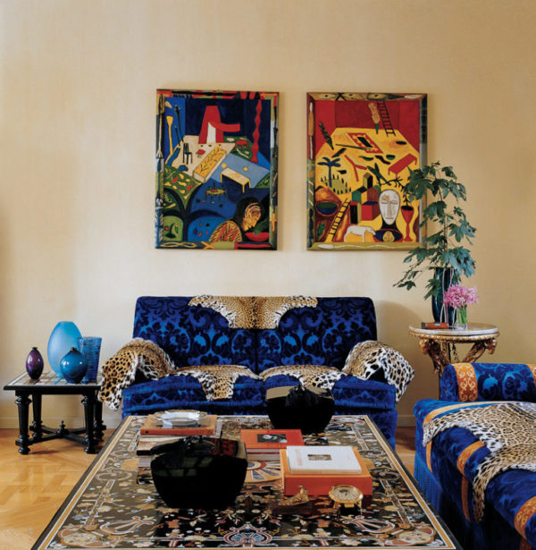 Le travail de son pinceau décore également les murs du salon au deuxième niveau. Il a été décidé de remplir l'espace restant de l'appartement avec des meubles de Versace.