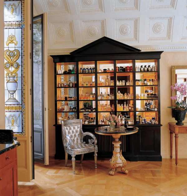 Une immense collection de spiritueux de la figure principale de la maison de couture Versace peut être vue sur la table française de style Empire. Toujours dans le couloir, il y a une armoire sombre avec un grand miroir.