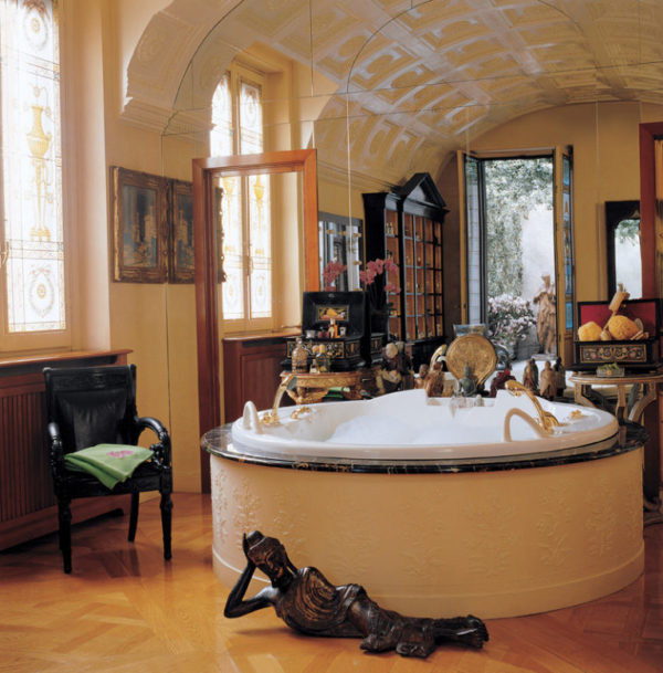 La salle de bain, que certains comparent au terrain de football, est décorée de chaises rembourrées en cuir noir. Une statue en bronze de Bouddha est située sur le sol laqué.