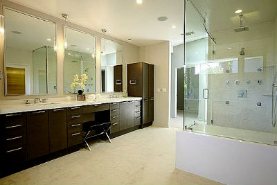 L'une des salles de bains est décorée dans un style classique. Les murs sont suspendus avec des miroirs qui augmentent visuellement l'espace. Les carreaux de sol sont beiges et des meubles chics sont installés le long du mur.