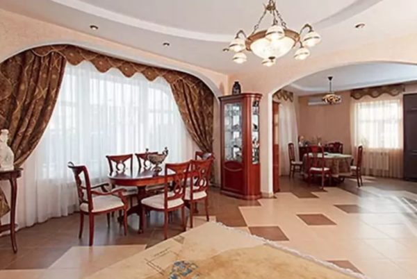 La salle à manger et le salon situés au rez-de-chaussée sont conçus dans un style classique. La maison dispose d'un mobilier coûteux en meubles artisanaux naturels italiens. La salle à manger a un coin cuisine, qui est résolu dans des couleurs sombres.