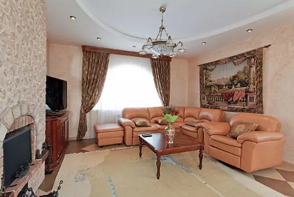 Le coin cheminée a des canapés en cuir marron clair véritable. La maison a beaucoup de tons beige clair et chaud.